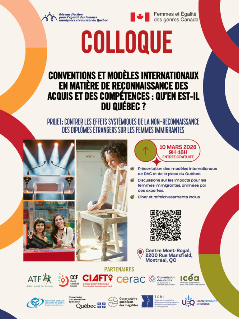 Ce colloque s’inscrit dans le cadre du projet du RAFIQ visant à contrer les effets systémiques de la non-reconnaissance des diplômes étrangers sur les femmes immigrantes.